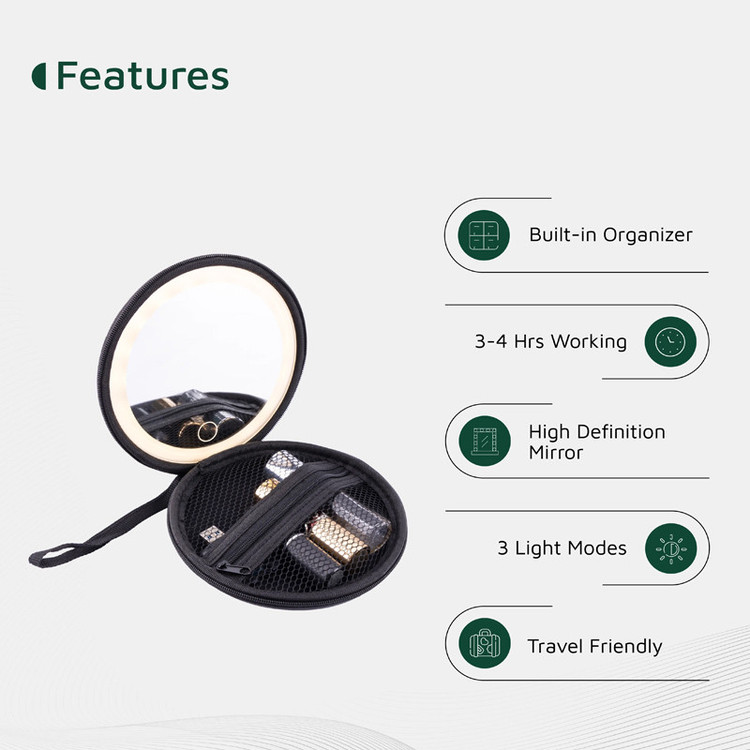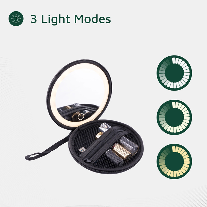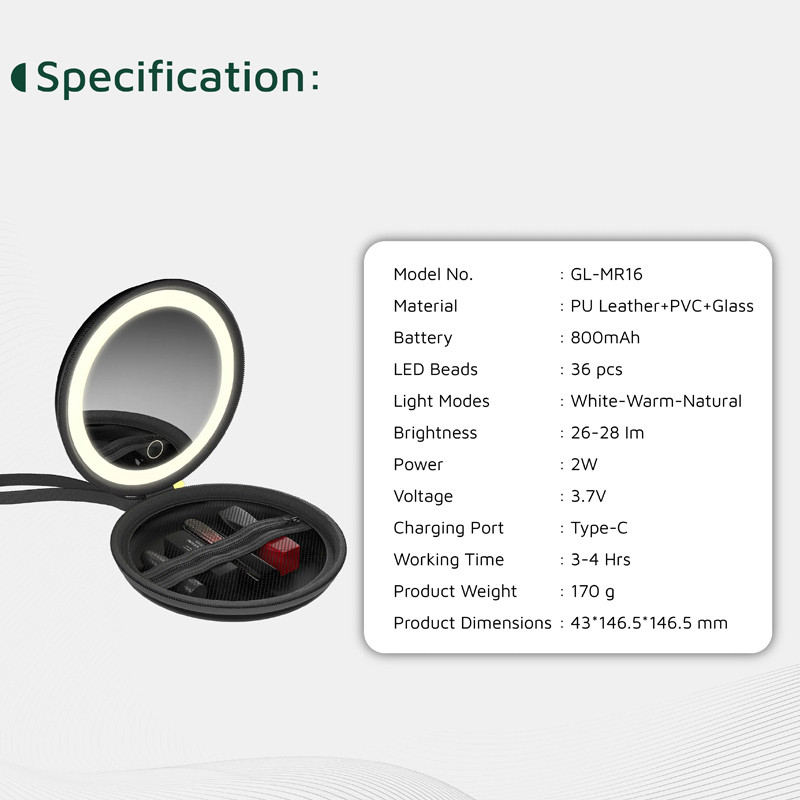 چرم PU مرغوب | PVC مقاوم | دارای نور با سه حالت سفید، گرم و طبیعی | کارکرد حدودی بین 3 الی 4 ساعت با فول شارژ بودن | پورت شارژ Type-C جهت شارژ | سیستم روشنایی داخلی با 36 مهره LED | روشنایی 26-28 لومن