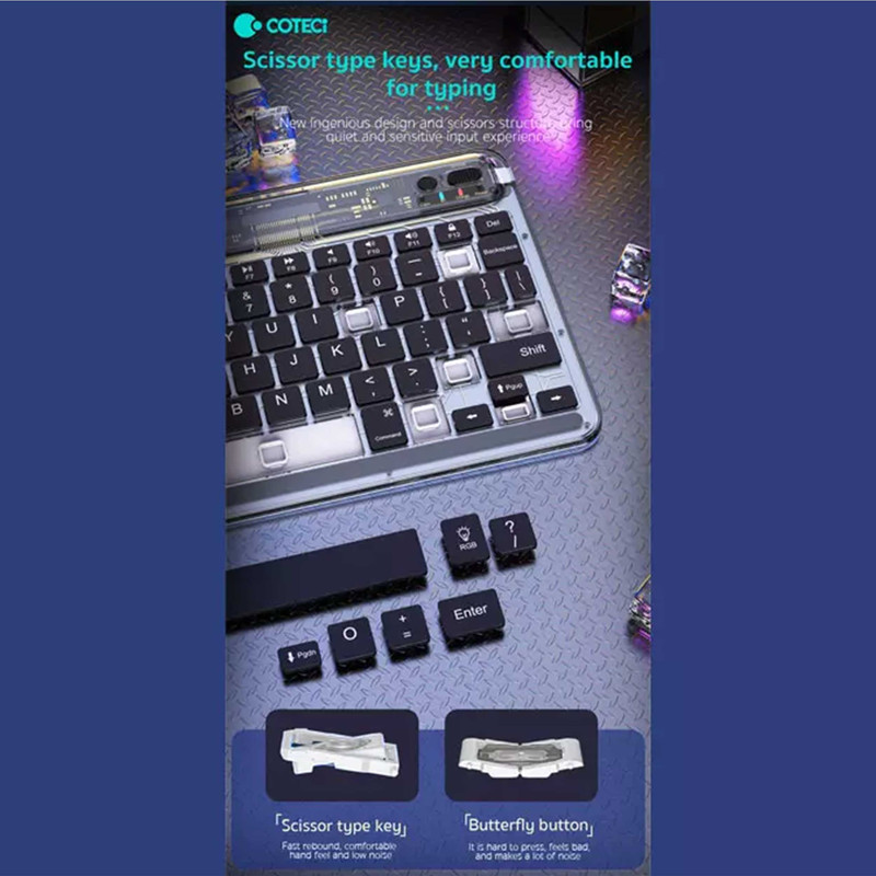 کار کردن با کامپیوتر، گوشی همراه و تبلت کاری اجتنابناپذیر است و ممکن است در طول روز با همه آن سروکار داشته باشیم؛ پس بهتر است برای استفاده راحتتر و همین طور سریعتر انجام شدن کارها از یک کیبورد استفاده شود.با پیشرفت تکنولوژی و اینترنتی شدن اکثر مشاغل استفاده از کامپیوتر نسبت به گذشته بیشتر شده است. داشتن یک کیبورد با کیفیت میتواند روند کاری شما را افزیش دهد. به علاوه کار کردن طولانی مدت با آن موجب خستگی شما نمیگردد.کیبورد کوتتسی مدل 84008 با طراحی زیبا، بسیار خوش دست میباشد و کار با آن راحت و لذت بخش است.صفحه کلید Coteetci Bluetooth Crystal keyboard 84008 رنگ های مختلفی دارد؛ وزن آن فقط 247 گرم است و طراحی جذاب با کلیدهایی در ارتفاع کم دارد که باعث شده صدای اضافه و اذیتکنندهای هنگام تایپ کردن نداشته باشد. بدنه آن را پلاستیک بادوام ABS تشکیل داده و در برابر آسیب بسیار مقاوم است.همچنین کلیدها ساختار X پای قیچی دارند و نیرو به طور یکنواخت وارد میشود و این ساختار تلاش و خستگی کمتر را به همراه دارد.انتهای آن با چرم ضد لغزش پوشانده شده تا در جای خود ثابت باقی بماند. همچنین در طراحی آن چراغ 7 رنگ هم وجود دارد که جذابیت آن را چند برابر کرده است.کیبورد بیسیم کوتتسی مدل 84008 از قابلیت اتصال سهحالته برخوردار بوده و بهشما اجازه میدهد تا آن را بهطور همزمان به 3 دستگاه متصل کنید؛ با سیستمعاملهای اندروید، iOS و اندروید سازگار است.بهعلاوه این محصول دارای یک باتری لیتیومی 500 میلیآمپرساعتیست که از طریق درگاه Type-C شارژ میشود. زمان مورد نیاز برای شارژ کامل 2.5 ساعت بوده و تا 60 روز البته بدون نور پس زمینه پاسخگوی شارژ باتری خواهد بود.درگاه ارتباطی این کیبورد بلوتوث و کابل تایپ سی میباشد