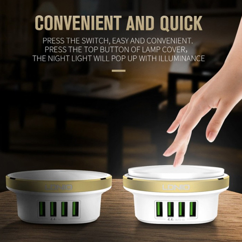 هاب الدینیو مدل Bedside Lamp همینطور دارای 4 پورت USB جهت شارژردهی می باشد. این پورت های USB دارای تکنولوژی Auto-ID هستند و شدت جریان خروجی را بسته به دستگاه متصل به آن به خوبی تنظیم و کنترل می کنند. این ویژگی سبب افزایش عمر باتری دستگاه متصل نیز می شود. توان خروجی این سه پورت 4.4 آمپر و 5 ولت بوده و لامپ های LED نیز دارای حداکثر توان 2.4 وات می باشند. البته تعداد لامپ های LED به کار رفته 12 عدد است. درجه حرارت لامپ این چراغ خواب 6500K می باشد.