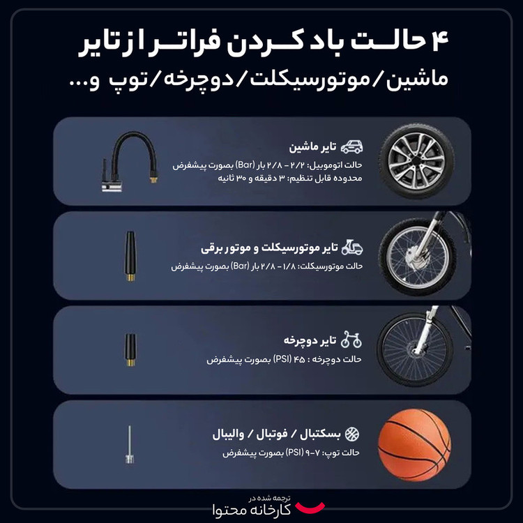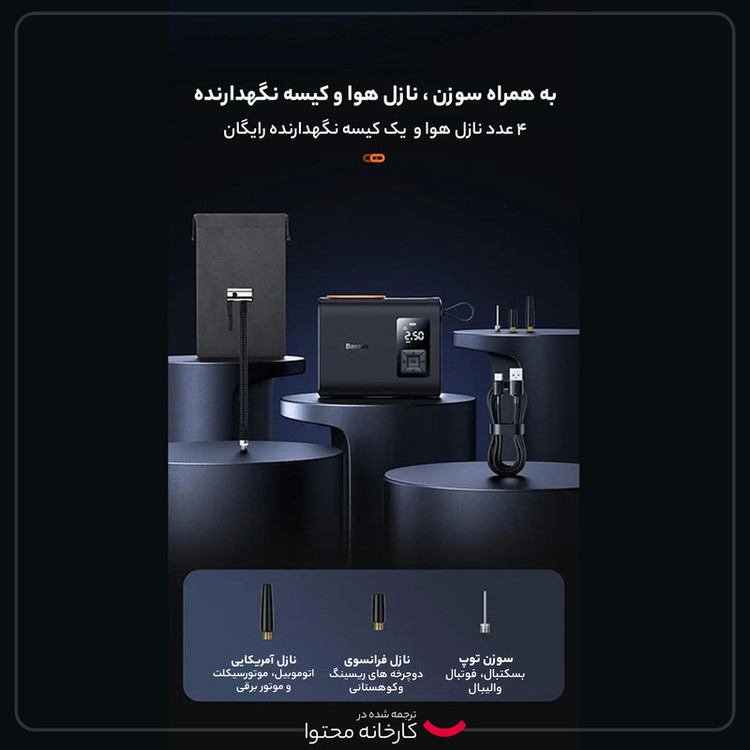 شلنگ برای باد کردن لاستیک، سه سری سوزنی، یک کابل شارژر و دفترچه راهنما و یک عدد کیسه پارچه ای برای لوازم همراه کالا