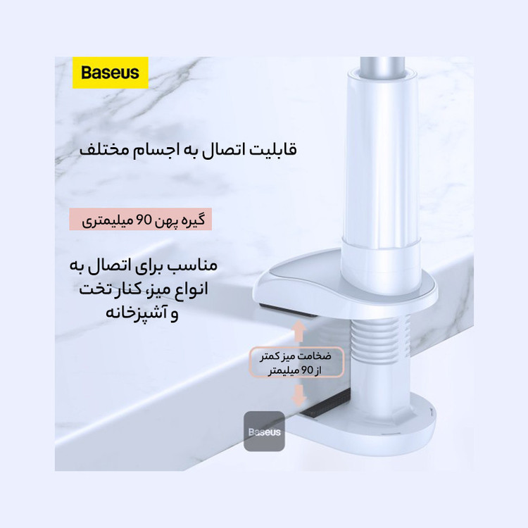 قابلیت باز شدن گیره هولدر تا ۹۰ میلی متر انعطافپذیر بودن قسمت بالایی هولدر قابلیت نصب آسان بر روی لبه میز قابلیت چرخش 360 سری