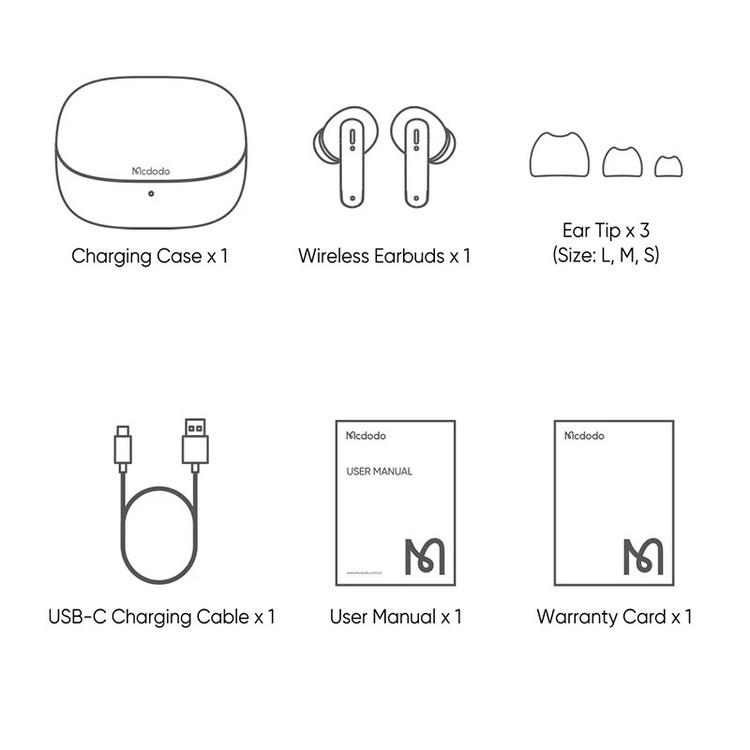 سایر توضیحات اقلام همراه هدفون، هندزفری و هدست: هدفون بلوتوثی مک دودو | سه سایز سری سیلیکونی | کابل شارژ تایپ سی | دفترچه راهنما