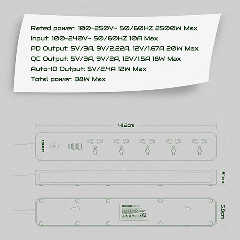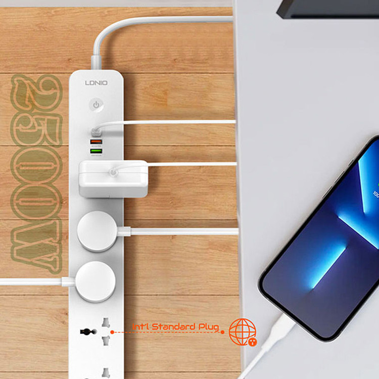 دارای 5 پریز و 3 پورت usb | دارای پورت تایپ سی PD و یو اس بی QC3.0 | دارای دکمه خاموش / روشن لمسی